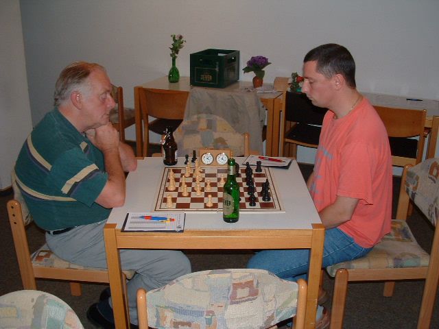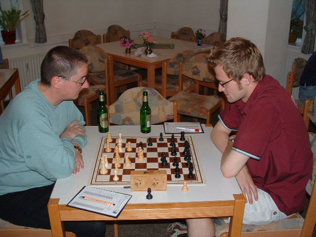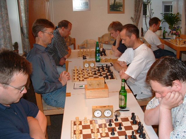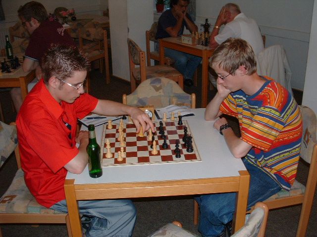 [23.07.2004] Die inzwischen 34 Teilnehmer des offenen SFB-Sommerturniers sahen in der dritten Runde 15 Paarungen. Erstmalig wurden alle drei Spielräume für das Turnier benötigt. Die Küche wurde kurzerhand zum Blitz- und Analyseraum umfunktioniert.
